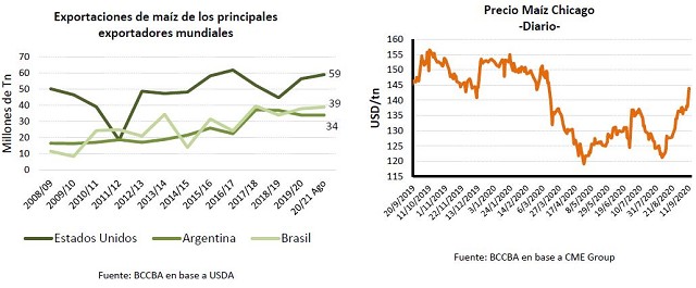 Las exportaciones de Brasil y Argentina, para la campaña 2019/20, se espera que alcancen los 73 millones de toneladas, lo cual representa una participación en el mercado mundial del 39%. Las causas de este crecimiento son la expansión del área sembrada en conjunto con las buenas condiciones climáticas que permitieron obtener niveles de producción por encima del promedio en ambos países. Las exportaciones récord de Brasil se sustentan principalmente en la cosecha récord de maíz safrinha. De acuerdo con datos de la CONAB alcanzaría los 75 millones de toneladas y representa el 73% del maíz total.