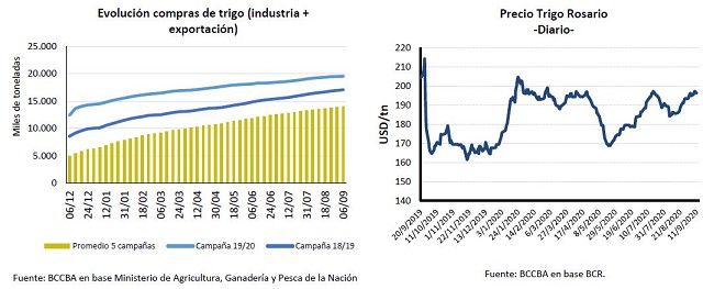 Según datos del Ministerio de Agricultura, Ganadería y Pesca de la Nación, las compras de trigo campaña 2019/2020 por parte de la industria y la exportación alcanzaron un nuevo récord. A la fecha, se llevan comercializadas 19,6 millones de toneladas, de las cuales 15,4 corresponden a la exportación y 4,2 a la industria. Respecto a la producción, la comercialización representa el 99%, cuando aún restan dos meses hasta el ingreso de la cosecha 2019/20, lo cual indica que prácticamente no queda cereal en mano de los productores. De esta manera, el precio en el mercado de Rosario se ubica en torno a los USD 196 por toneladas. Para el trigo nuevo, el precio aumentó USD 13 en el último mes, alcanzando los USD 187 por toneladas, como consecuencia del clima seco que perjudicaría los rendimientos en algunas zonas productoras como la provincia de Córdoba, obligando a recortar las proyecciones de producción que alcanzarían los 18 millones de toneladas de acuerdo con la Bolsa de Comercio de Rosario.