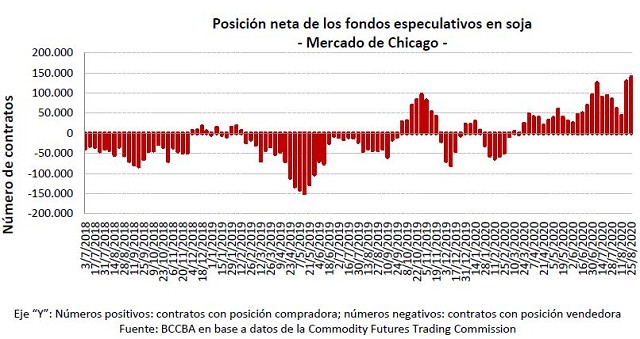 La posición neta de los fondos especulativos continúa siendo comprada y se profundizó en las últimas semanas, alentados por las buenas noticias respecto a las exportaciones estadounidenses, un clima menos favorable a lo esperado y un contexto internacional de tasas bajas que provoca que algunos fondos se vuelquen a los mercados de los commodities.