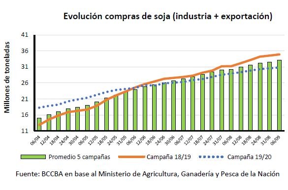 A la fecha, se han vendido 30,8 millones de toneladas de la cosecha 2019/20, de las cuales 7,8 millones de toneladas corresponden al sector exportador y 23 millones de toneladas a los industriales. Del total de la producción de la campaña se ha vendido el 57%, quedando un remanente de 23,2 millones de toneladas. Respecto al promedio de las últimas cinco campañas, la comercialización se encuentra 7 puntos por debajo debido a los precios bajos que se observaron al momento de la cosecha en detrimento con los valores para la posición noviembre del corriente. En mayo, el valor promedio en Rosario fue de USD 215, un precio que generaba que muchos productores no tuvieran incentivos a vender debido a los escasos resultados económicos.
