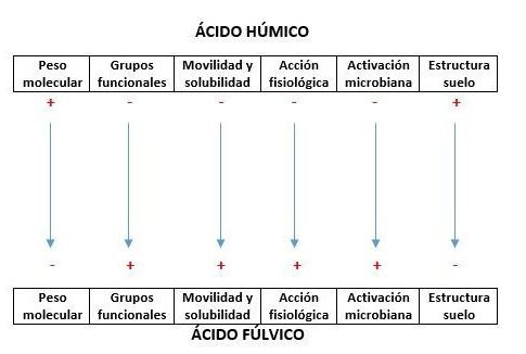 A priori, los ácidos húmicos tienen un efecto más continuado y persistente en el suelo, se usan para mejorar las propiedades del suelo y, sobre todo, para aumentar la capacidad de intercambio catiónico (CIC) del suelo.