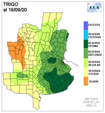 El núcleo triguero del sur bonaerense aparece en casi toda su extensión con mejor disponibilidad de humedad repitiéndose el gradiente este oeste. De todas maneras hay que decir que en áreas del centro del sudeste bonaerense el ajuste de las reservas con el magro comportamiento pluvial de septiembre ya enciende algunas alertas.