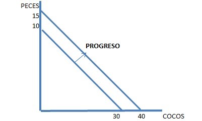 Ahora bien, si Crusoe ahorra parte de los cocos que baja cada día al igual que parte de los peces que pesca con sus manos y, aprovisionado de alimentos, dedica unos días a construir una escalera para bajar los cocos y una red para pescar (aumenta su stock de capital), incrementa su productividad y consigue 40 cocos en vez de 30 y 15 peces en vez de 10. Crusoe entra en una senda de progreso porque aumenta su productividad. En el mismo tiempo de trabajo consigue más cantidad de bienes, con lo cual, puede ahorrar más para aprovisionarse y hacerse una choza o y otras cosas que puede necesitar. Va mejorando su calidad de vida.