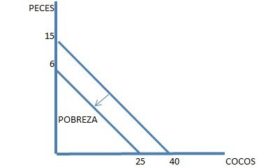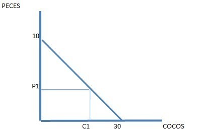 Imaginemos a Robinson Crusoe que en la isla que vive, tiene que treparse a los árboles para bajar los cocos y pescar con sus manos. Supongamos que Crusoe dedica 8 horas a buscar sus alimentos. Si destina las 8 horas a bajar cocos de los árboles, consigue 10 peces y 30 cocos, como puede verse en el gráfico 1