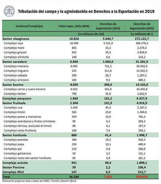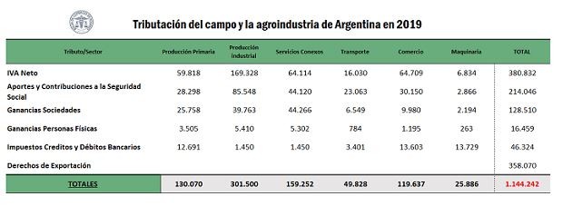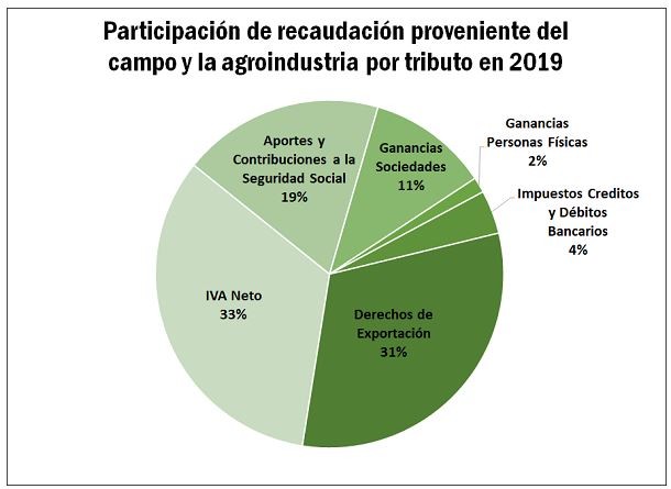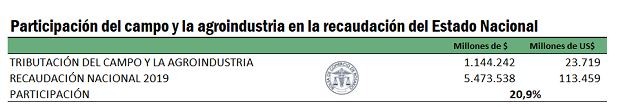 Según estimaciones de la Bolsa de Comercio de Rosario, en el año 2019 el campo y la agroindustria de nuestro país habrían generado una recaudación tributaria para el Estado Nacional por una cifra cercana a los $ 1.144.000 millones de pesos, unos US$ 23.700 millones tomando en cuenta el tipo de cambio oficial promedio para dicho año. Esto representa un 20,9% de la recaudación total de nuestro país para dicho año –sin computar impuestos de jurisdicción provincial-, por lo que 1 de cada 5 pesos que ingresaron a las arcas del Estado Nacional habrían estado explicados por la actividad del campo y la agroindustria.