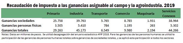 A través de la sumatoria de la recaudación de estos sectores (multiplicados por la participación estimada del campo y las cadenas agroalimentarias) se obtuvo la suma de la tributación estimada del impuesto a las ganancias para las sociedades para el campo y la agroindustria a nivel nacional. Al carecer de desagregación para la masa tributada en el impuesto a las ganancias para personas humanas, se procedió a aplicar a dicha cifra, y a cada uno de los sectores, un factor equivalente a dividir la recaudación total de impuesto a las ganancias para personas humanas respecto de la recaudación total del impuesto a las ganancias para sociedades.
