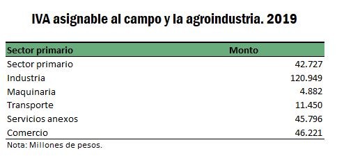 Estos factores se aplican para todos los eslabones excepto para el Sector Primario, cuyo total no requiere ponderación (es el 100%). De la aplicación de dichos factores se obtuvo la siguiente tabla de resultados para la recaudación de IVA Nacional asignable al campo y la agroindustria para el año 2019.