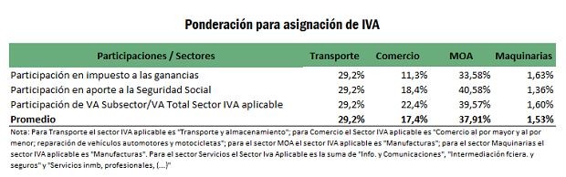 En el caso del Impuesto al Valor Agregado, se tomó la información en grandes rubros, sin desagregar, y se aplicaron distintos factores con el objeto de obtener la participación del campo y la agroindustria en el total. Se utilizó un promedio de tres ponderadores para asignar participación correspondiente sobre las categorías en las que se desagrega IVA (sector IVA aplicable). Se utilizó: (I) participación en el Impuesto a las Ganancias de Sociedades, (II) participación en Aportes y Contribuciones a la Seguridad Social, y (III) participación del Valor Agregado del subsector sobre el Valor Agregado del sector IVA aplicable. Las ponderaciones se resumen en la siguiente tabla.