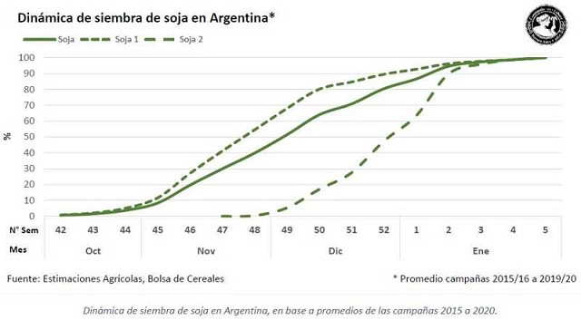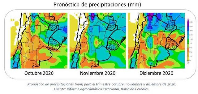 En la segunda quincena de octubre dará inicio la siembra de soja de primera 2020/21 en las provincias de Entre Ríos y Santa Fe. La perspectiva climática de mediano y largo plazo pronostica lluvias moderadas a abundantes en las regiones primicia de siembra. Posteriormente, a medida que nos vayamos adentrando en la ventana de siembra, se prevé registrar mayores recargas en los perfiles a partir de noviembre, con pronóstico de lluvias abundantes en amplios sectores de la región agrícola, a excepción del centro-este de Córdoba en donde los promedios acumulados descienden levemente en comparación a su periferia. Estas recargas de noviembre serán muy importantes, dado que reabastecerán el perfil del suelo en lotes previamente ocupados con trigo y cebada, sobre todo en la provincia de Córdoba y Santa Fe en donde los valores de lluvias acumuladas en lo que va del año se ubican por debajo a los promedios históricos.
