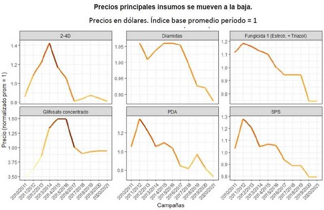 Con respecto a los precios de los principales insumos, se observa una baja para la campaña 2020/21. En el siguiente gráfico se presenta un conjunto de insumos utilizados en los planteos de soja. Los precios están normalizados con base igual a uno en el promedio del período, por lo que si los valores son menores a la unidad esto significa que se encuentran por debajo de la media histórica. Entre los herbicidas, el 2-4 D registra una baja de 3,9%, en tanto que el glifosato concentrado se mantuvo estable. También se registran reducciones en fertilizantes, PDA cayó 12%, aunque el SPS se mantuvo estable. En el mismo sentido, los precios de fungicidas se mantuvieron estables.