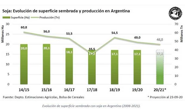 En paralelo, de concretarse esta proyección, el área total destinada a la siembra de los seis cultivos extensivos más importantes (trigo, cebada, soja, maíz, girasol y sorgo granifero) registraría una retracción interanual del 1,6 %, en gran medida explicada por limitaciones ambientales y leves expansiones de superficie ocupada por cultivos regionales. Por otra parte, teniendo en cuenta las perspectivas climáticas para los próximos meses, la proyección de producción para el próximo ciclo de soja ascendería a 46.500.000 toneladas, registrando una caída interanual de - 5,1 %, equivalente a 2,5 millones de toneladas.