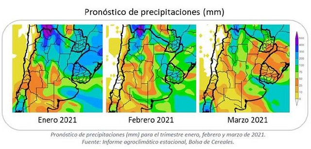 Posteriormente, durante el trimestre enero, febrero y marzo 2021 se prevén deficiencias hídricas en diferentes sectores de la región agrícola, pero mayormente ubicadas sobre su margen oeste. En paralelo a esta heterogénea acumulación de precipitaciones, las temperaturas máximas durante el verano continuarán incrementando la demanda de agua, pudiendo comprometer la condición del cultivo en regiones que no hayan consolidado previamente la oferta hídrica en sus suelos.