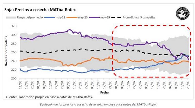 En el mercado doméstico, el precio a cosecha futuro mayo 2021 en el MATba – Rofex, siguió una dinámica similar. De marzo a junio los precios se ubicaban por debajo de los mínimos de las últimas cinco campañas. Una vez que entramos en el periodo de precampaña, comprendido entre julio y septiembre, los precios registraron un sostenido crecimiento. No obstante, en el promedio del periodo de precampaña, las cotizaciones aún se encuentran un 2% por debajo de los registrados en la campaña previa y un 9% por debajo del promedio de las últimas cinco campañas.