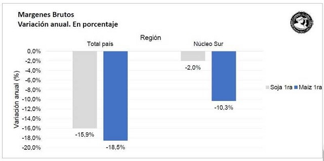 A continuación, se presenta una tabla con la evolución de los márgenes brutos para soja de primera y maíz temprano para el promedio nacional y la región núcleo sur. El promedio surge de ponderar los márgenes de cada región por su superficie sembrada correspondiente. Como se observa, la caída del valor de la producción por lo menores precios y menores rindes supera la baja de los costos descripta anteriormente. No obstante, la baja de los márgenes de soja es inferior a la observada en otros cultivos, como es el caso del maíz temprano: mientras que los márgenes brutos de soja caen 16% y 2% para el total país y la región núcleo, la variación registrada en los márgenes de maíz es de -18,5% y -10,3% respectivamente. En ese sentido, la soja muestra una mejor performance relativa (ver gráfico de variación de márgenes).
