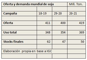 Finalmente, vale repasar la situación global de oferta y demanda. El cuadro que sigue muestra la situación delicada en términos de stocks para el período 20/21, con un acentuado aumento del consumo.