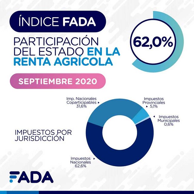 FADA (Fundación Agropecuaria para el Desarrollo de Argentina) dio a conocer su medición trimestral sobre cuánto de la renta agrícola (ingresos menos costos) queda en manos del Estado: 62%. Dicho en otras palabras, de cada $100 de renta, $62 no son para el productor, sino que son impuestos nacionales, provinciales y municipales.