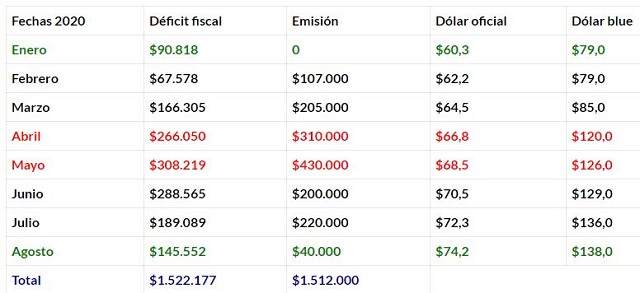 . – Si observás la tabla adjunta, podrás apreciar que cuando la emisión es baja no hay gran salto en la cotización del dólar blue y la brecha se achica, sin embargo, cuando la emisión es muy abultada la brecha crece. Es lo que podés apreciar en abril y mayo, cuando la emisión excedió el déficit, esto hizo que la brecha se agrande. En el caso de enero y agosto, con descenso en la emisión o nula impresión de papeles, la brecha se hizo más pequeña.