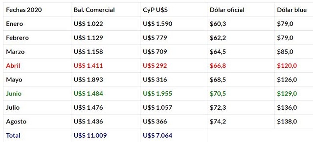 . – El mayor colapso de déficit, emisión y bajo cobro de exportaciones se dio en los meses de abril y mayo, en esos meses vimos una fuerte suba del dólar blue y un acrecentamiento de la brecha. Daría la impresión que en agosto estamos en problemas, en función de los bajos cobros de exportaciones, si en septiembre se repite un resultado bajo, y el gobierno acelera la emisión monetaria, viviremos un nuevo salto del blue.