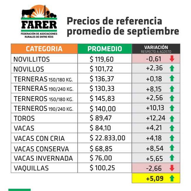 En síntesis, los precios promedio que arrojaron los remates en la provincia de Entre Ríos en el mes de septiembre de 2020 fueron los siguientes: