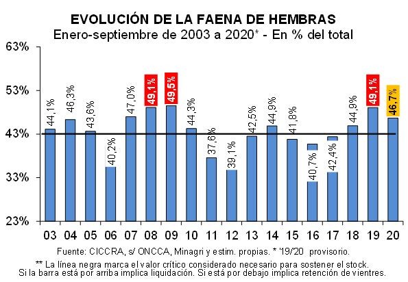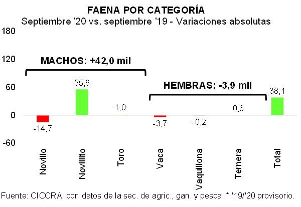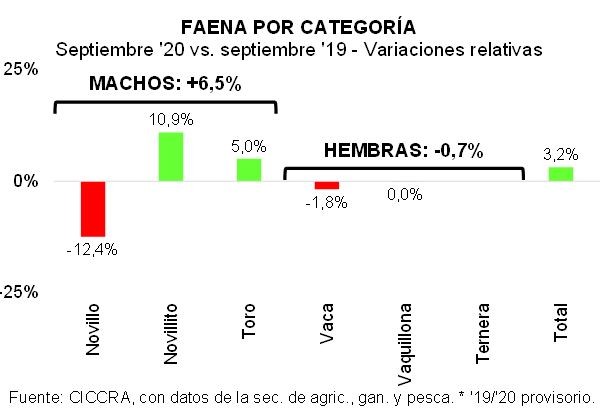 En total se faenaron 5,528 millones de machos, es decir 7,0% más que en los primeros nueve meses del año pasado (+363,3 mil cabezas). En tanto, la faena de hembras bajó a un total de 4,837 millones de cabezas, exhibiendo una caída de 2,9% anual (-142,0 mil cabezas). Por lo tanto, la importancia de las hembras en la faena total bajó a 46,7% en lo que va de 2020 (-2,4 puntos porcentuales).