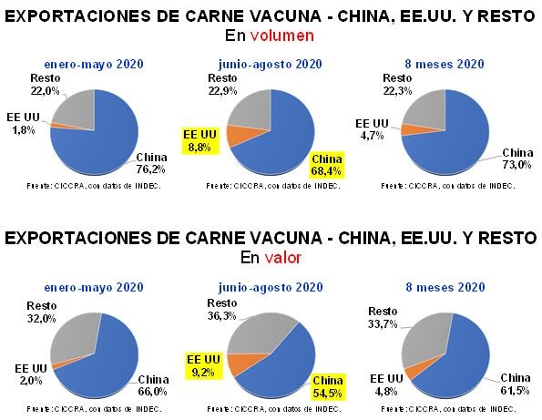 Las menores ventas a China se compensaron en gran medida con mayores exportaciones de cortes de vaca a EE.UU. en los últimos tres meses (en el trimestre junio-agosto el promedio mensual exportado a EE.UU. fue de 4,6 mil tn pp, con un pico de 5,7 mil tn pp en julio; el volumen exportado a EE.UU. se multiplicó por 5,8 respeto de enero-mayo de 2020; esto se reflejó en la disminución del precio promedio de los embarques a este destino) y también con la reactivación de las ventas a Chile, Israel, Alemania y Rusia en los últimos dos meses.