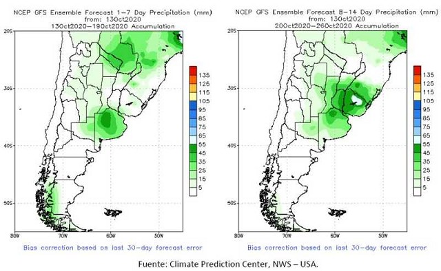 De acuerdo con el modelo GFS (Global Forecast System) entre el 13 y 19 de octubre se prevén precipitaciones de 5 a 15 mm en la provincia de Santiago del Estero. A su vez, durante la semana del 20 de octubre, la situación podría mejorar para el centro y sureste de la provincia, en la cual, se prevén entre 15 y 25 mm.