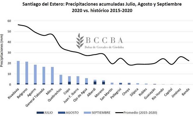 Las precipitaciones del último trimestre fueron, para todos los departamentos, inferiores al promedio histórico de los últimos 5 años. Como se podrá observar en el gráfico a continuación, el registro de precipitaciones acumuladas durante julio, agosto y septiembre se ubicaron en un rango que varía entre los 16 mm y los 22 mm para los departamentos del sureste de la provincia. Sin embargo, en el resto de los departamentos, las precipitaciones acumuladas no superaron los 9 mm.