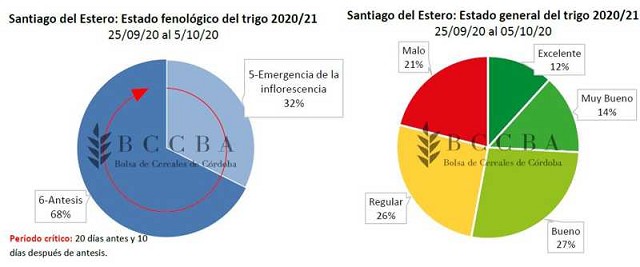 La totalidad de la superficie triguera se encuentra atravesando el período crítico, en la cual el 68 % tiene un estado fenológico más avanzado, en estado de antesis, mientras que el 32 % restante en emergencia de la inflorescencia.