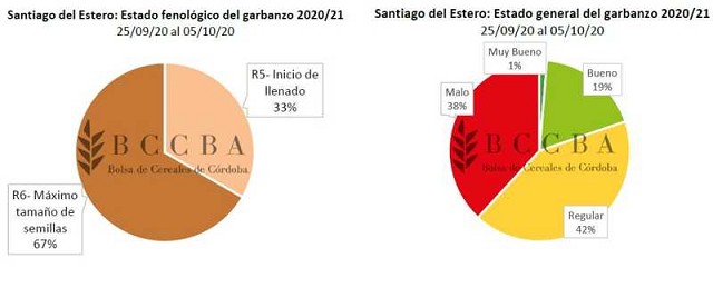 La superficie sembrada con garbanzo en Santiago del Estero para el 2020/21 podría ser similar a la campaña 2019/20, alcanzando 5.500 ha. El 80 % se encuentra en estado general regular a malo, al igual que en trigo, las causas son los daños producidos por la falta de agua en el suelo y las temperaturas bajas durante el mes de septiembre.