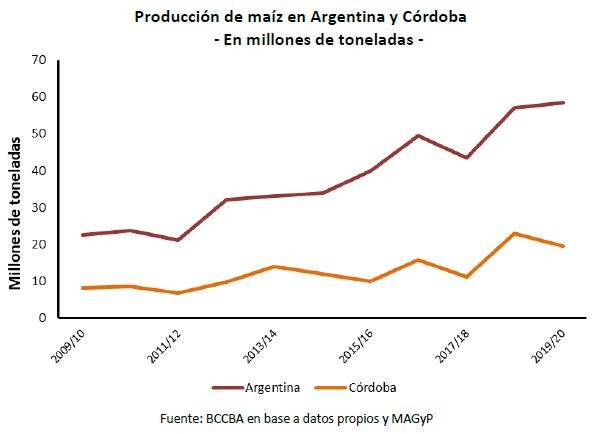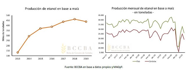 La industria etanolera se alza como una de las posibles ramas para agregar valor al cereal que se expandió en las últimas campañas. En 2013 la producción de etanol alcanzó las 133 mil toneladas, y en los años posteriores se observó un crecimiento anual promedio del 28%, llegando a una producción de 438 mil toneladas en 2019. La suma del etanol producido en todo este período equivaldría a transformar y agregar valor a 8 millones de toneladas de maíz, del cual un promedio del 72% provendría de Córdoba.