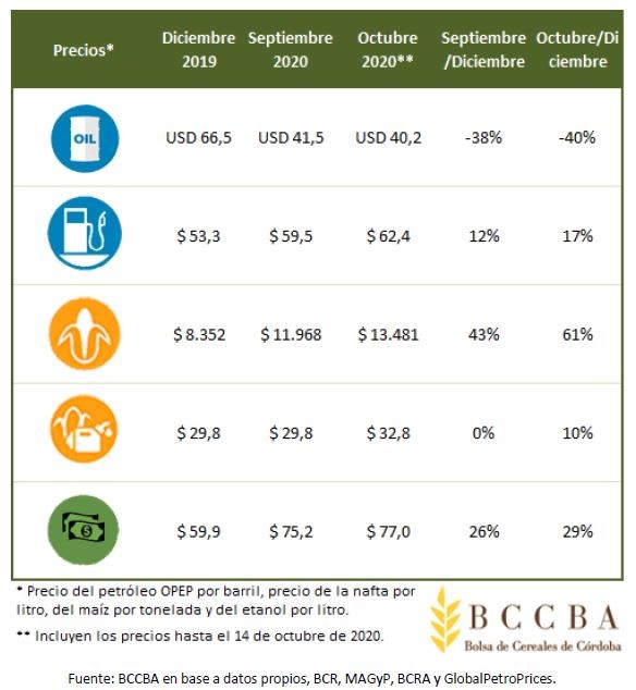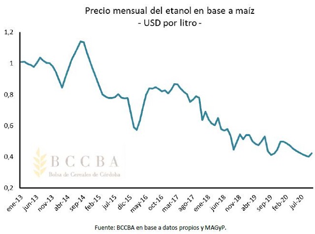 El precio del etanol en base a maíz ha demostrado una caída continuada desde inicios de 2017, cuando se ubicaba en promedio a USD 0,85 el litro, hasta llegar a USD 0,42 el litro en la primera mitad del mes de octubre de 2020. La velocidad de incremento de los precios en pesos fue inferior al incremento en el valor del dólar en los últimos años, generando una merma de valor. Sin embargo, el precio del etanol se fijó en $ 29,8 el litro en diciembre de 2019 y fue incrementado un 10% a mitad de octubre del año corriente, alcanzando los $ 32,8 el litro.