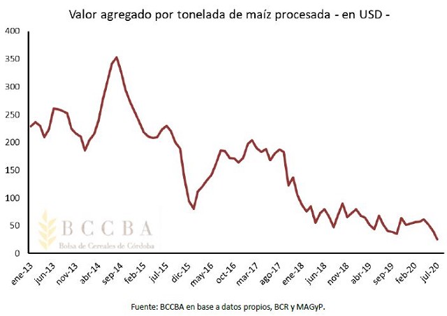 El valor del etanol, junto al precio del maíz, se encuentran directamente relacionados al valor agregado que se puede generar en la industria. Aun así, el mercado de etanol no se encuentra regido por la oferta y demanda, sino que su precio es regulado por fórmulas de actualización y mediante decretos. Así, en 2013 se agregaba un promedio de USD 235 de valor a cada tonelada de maíz que se transformaba en etanol, mientras que en lo que va de 2020 este guarismo decayó a un promedio de USD 50 por tonelada.