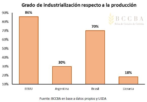 Argentina cuenta con un elevado nivel de industrialización respecto a la soja, pero en lo que al maíz respecta, la industrialización alcanza en promedio un 30% de la producción. Dentro de los principales países productores del cereal, Estados Unidos industrializa el 86% de lo cosechado y Brasil el 70%.
