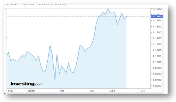 El gráfico que sigue nos muestra la suba del euro en relación al dólar desde abril a la fecha.