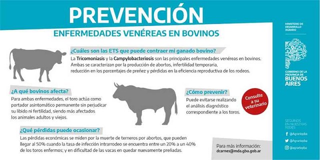 La Plata.- El Ministerio de Desarrollo Agrario, junto a 80 municipios de la Provincia de Buenos Aires, lanzó una campaña de Prevención de Enfermedades de Transmisión Sexual (ETS) en bovinos, con el objetivo de generar conciencia entre los productores bonaerenses acerca de la importancia de realizar los testeos de venéreas en el ganado para mejorar la sanidad de los rodeos y aumentar la productividad.