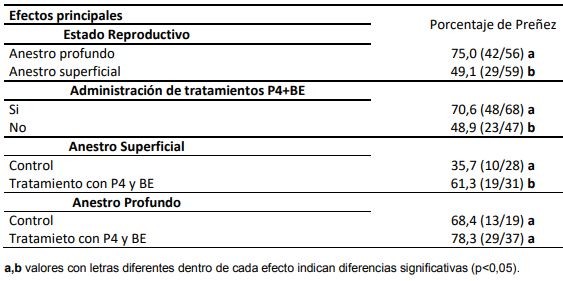 Tabla 1. Efecto del tratamiento combinado de progesterona con estradiol y del estado reproductivo de vacas Angus sobre el porcentaje de preñez luego de un servicio natural con toros.