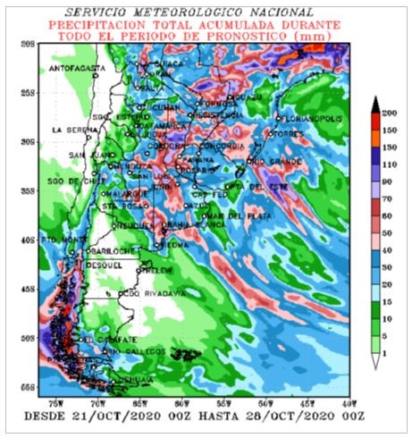 En el mapa se representan las lluvias previstas para los próximos días, la convección y las lluvias frontales suman para hacer más vasta el área de cobertura y esto es justamente lo que estamos esperando, una atmosfera más activa ya en momentos en que la primavera está asentada y debería dar cuenta de ello con una mejor oferta de agua.
