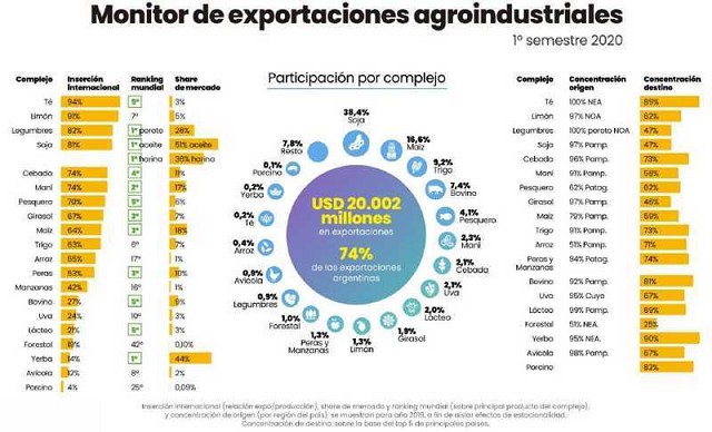 En el primer semestre de 2020, el total de exportaciones agroindustriales contribuyeron con un total de USD 3.643 millones en concepto de derechos de exportación (DEX), de los cuales el complejo soja representa el 69%. El DEX es un tributo que atenta contra el federalismo, ya que extrae recursos de las provincias productoras y no se distribuye de manera automática por coparticipación. En los principales complejos exportadores las provincias pierden recursos, por ejemplo: