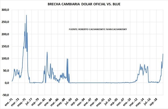 Al momento de redactar estas líneas, la brecha cambiaria entre el dólar oficial y el blue se encuentra entre uno de los más altos picos históricos de brecha cambiaria de los últimos 50 años. En efecto, la brecha cambiaria está en el 119% entre el blue y el oficial, aunque si uno toma el tipo de cambio soja, supera el 200%.