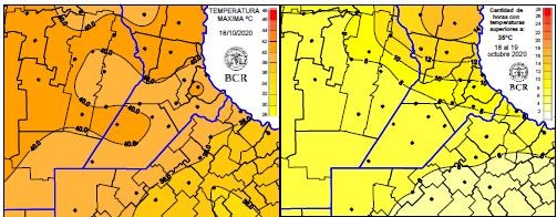 El evento duró poco, solo se presentó el 18 y 19 de octubre, pero sorprendió a todos por su intensidad. Los termómetros superaron los 40°C en la porción norte como en Irigoyen con 41,4°C o Noetinger con 41°C. El aire frío que anunciaba el inicio de la tormenta minimizó el impacto en el sur de la región. Allí, solo fueron de 5 a 7 las horas en que las temperaturas superaron los 35°C. Pero en el norte de la región, dónde buena parte de los cultivos están en el inicio de llenado o pleno llenado, hubo entre 13 a 15 horas con los termómetros superando los 35°C. En Carlos Pellegrini, los ingenieros comentan que “muchas espigas no emitirán nuevos granos ante esas condiciones”. “Las altas temperaturas acortarán el llenado”, dicen en Cañada de Gómez. En Bigand, señalan que la ola de calor bajará aún más el potencial zonal de rinde.