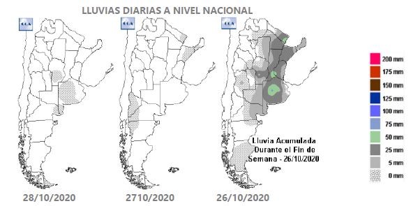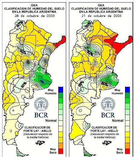 Faltan aún muchos milímetros para que los suelos alcancen el 90% de la capacidad de campo en el oeste y norte de la región núcleo, pero el cambio que hubo respecto a diez días atrás es rotundo. Esto ha sucedido luego de dos fines de semana con lluvias muy importantes que han dejado como promedio 100 mm de acumulado mensual. Las dos imágenes de la reserva de agua útil en el suelo (teniendo en cuenta la demanda de una pradera permanente) son más que elocuentes, la primera es del 28/10/2020, la otra del 30/10/2019. Para esa fecha del 2019, el Pacífico mostraba índices de un año neutro que evolucionaban a un calentamiento, un “Niño” que no llegó a concretarse. En cambio ahora el enfriamiento ya señala la presencia de “La Niña”. Precisamente por eso es tan importante que la región haya podido recuperar reservas hídricas. En estas condiciones, lo mejor que puede suceder es que la región alcance lluvias normales. Aiello agrega, “es importante destacar que las condiciones de circulación son favorables para lluvias normales. De todos modos, el árbol no debe taparnos el bosque y a pesar del importante alivio pluvial recibido, “La Niña” sigue vigente y de uno u otro modo seguirá marcando el ritmo del semestre cálido”.