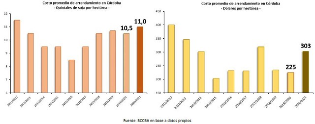 La segunda estimación de arrendamientos agrícolas para la campaña 2020/21 dio como resultado un costo promedio de la tierra de 11 quintales de soja por hectárea para la provincia de Córdoba, nivel que se mantiene cercano a la primera estimación y es 0,5 quintales más elevado que el costo de arrendamiento de la campaña anterior. Al medir los alquileres en dólares, se observa un incremento de USD 78 por hectárea en comparación al año anterior. Si bien el mayor arrendamiento hizo subir el costo en dólares, la razón fundamental de este incremento es por la suba del precio de la soja, que se espera en USD 276 /tn para mayo de 2021.