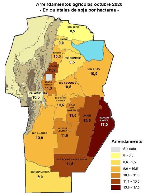 Los alquileres más elevados se encuentran en el este y sureste de la provincia, donde los arrendamientos más caros son en Marcos Juárez con un promedio de 17 qq/ha, seguido por Unión (13,5 qq/ha) y Pte Roque Sáenz Peña (11,5 qq/ha). Por otro lado, a medida que uno se aleja hacia el norte y el suroeste de la provincia, se pueden observar alquileres más bajos, encontrando el mínimo en Río Seco (8,5 qq/ha), seguido por Tulumba (9 qq/ha) y General Roca (9 qq/ha).