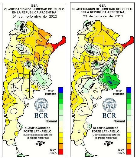 “Estamos a pleno”, señalaban los técnicos y no era para menos: en apenas 7 días se sembraron 1,7 M de ha, la mitad de la soja de primera. La capacidad de siembra vuelve a sorprender, el año pasado se había alcanzado a sembrar 1,1 M de ha en siete días, algo que parecía insuperable. Las lluvias de fines de octubre fueron claves para que suceda esto: destrabaron una situación muy difícil y alcanzaron a toda el área, incluyendo el norte y oeste de GEA, zonas que tenían un déficit hídrico de 120 a 180 mm. En total se avanzó sobre el 52% del área intencionada, cubriendo prácticamente 1,8 M ha soja de primera de la región. La humedad para la siembra es buena aunque en algunas zonas comienza a escasear. "Se va a sembrar hasta el sábado y luego se esperará la lluvia”, comentan los ingenieros de Cañada de Gómez y Villa Eloísa.