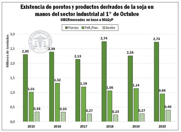 Al primero de octubre, los stocks de soja en manos del sector industrial se ubicaban en 2,7 millones de toneladas, un 20% por encima del año previo, aunque por debajo de 2018. Los stocks de harina se encontraban a esa fecha incluso por debajo del valor de los últimos cinco años con 0,95 Mt. El stock de aceite, producto de la fuerte baja en la demanda para producción de biocombustibles, se ubicaba el 1 de octubre casi un 50% por encima de 2018.