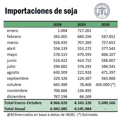 En cuanto a la mercadería importada, se observa un incremento en el flujo comercial en lo que va del año. En el mes de septiembre, se importaron cerca de 563.000 toneladas de soja, principalmente del Paraguay, tres veces por encima del mismo mes del año previo, al mismo tiempo que se estiman importaciones por entre 400.000 y 500.000 toneladas para el mes de octubre. En total, la estimación de importaciones para los primeros 10 meses del año arroja 5 millones de toneladas de soja.