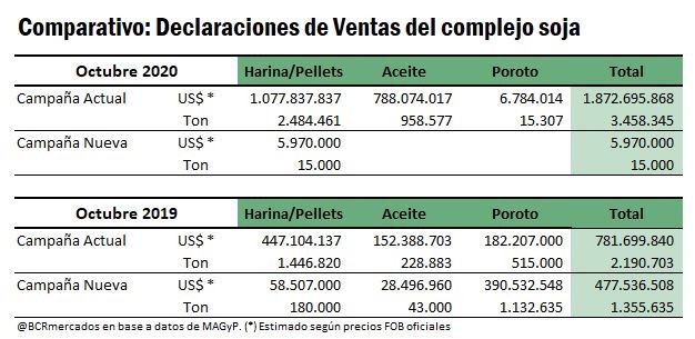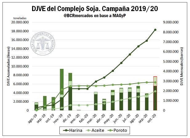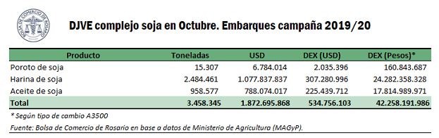 En el mes de octubre se registró la mayor venta externa mensual de productos del complejo industrial oleaginoso en lo que va del 2020 para la campaña comercial 2019/20.