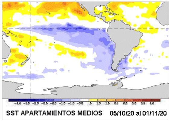 Durante el mes de octubre, toda la cuenca oceánica central del Pacífico Ecuatorial ha visto consolidar su enfriamiento superficial el cuál, como es común, se extiende hacia las costas de Sudamérica. El acople de este enfriamiento a la circulación atmosférica se verifico con un aumento de la intensidad de los vientos alisios. Esto comienza a jugar en contra a la hora de esperar eficiencia en los flujos de humedad de origen amazónico.