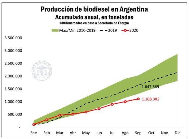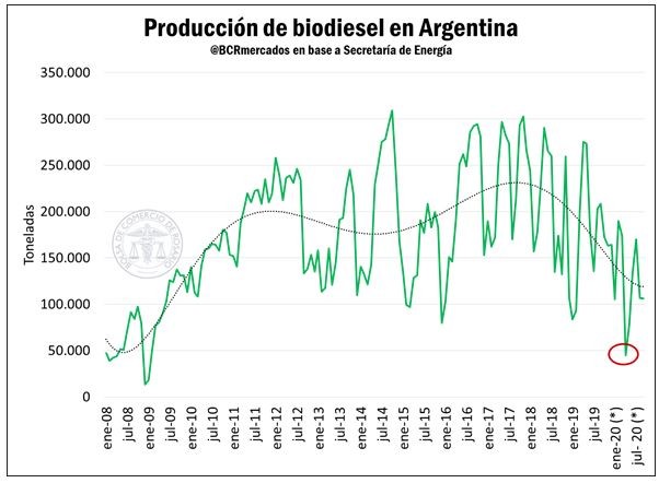 Si bien la producción de biodiesel ha sido altamente volátil en Argentina, sujeta a cambios tanto en la política comercial doméstica (como ser en el corte obligatorio) como externa (especialmente alteraciones en el acceso a los mercados internacionales y competitividad respecto a los combustibles fósiles), resulta claro que este 2020 la crisis del mercado energético le imprimió un duro golpe al sector.