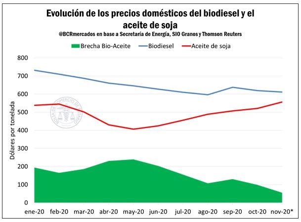 Del lado de los precios, a un valor de referencia establecido en $ 48.533/t a partir del mes de abril, se observa una erosión de la rentabilidad de la industria de biodiesel respecto a la evolución del precio del aceite de soja. Tomando los valores promedio del mercado interno en base a los datos volcados en SIO Granos y expresando ambos en dólares para una mejor comparación, puede verse que la brecha entre ambos se redujo un 50% en lo que va del año.